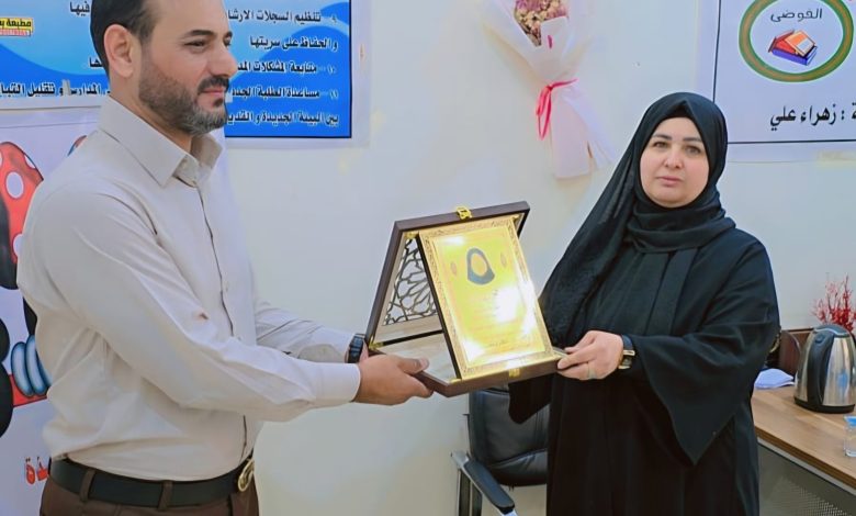 كرم الاستاذ رافد القريشي مدير عام وكالة الحرة RT الاستاذة حنان شنيور سلمان مديرة مدرسة النوافل الابتدائية للبنات،